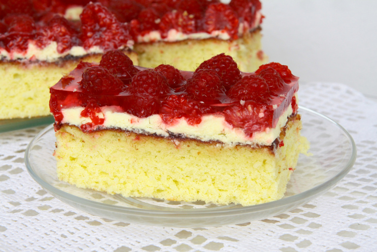 To ciasto to malinowa bomba w najlepszym tego słowa znaczeniu. Jest tu wszystko: świeże maliny w galaretce, malinowy kisiel z soku, malinowy dżem, a do tego jeszcze wspaniale puszysty biszkopt i delikatna masa budyniowa.
