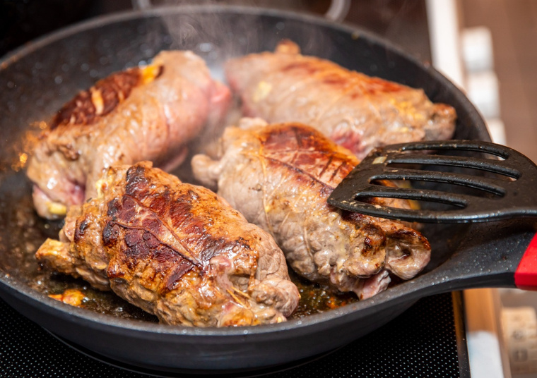 Rozbij je tak, by brzegi były cieńsze niż środek. Dzięki temu końce po zwinięciu będą się dobrze trzymać. Zwijaj roladę dłońmi zwilżonymi zimną wodą - dzięki temu pójdzie to szybciej i sprawniej. Następnie surowe rolady trzeba mocno przesmażyć na dużym ogniu - tak, by pory mięsa szybko się zamknęły, a soki zostały w środku - na granicy przypalenia. Dzięki temu sos i danie będą później tylko lepsze. Ułóż je na patelni wolną końcówką sznurka do dołu, by „przykleił się” na dobre do mięsa.