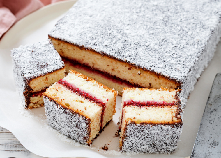 Australijskie ciasto z dżemem (znane również jako lamingtony) to niemal kultowy deser w tym kraju. Pochodzi z Queensland i zostało nazwane tak na cześć lorda Lamingtona, gubernatora stanu z końca XIX wieku. Od tamtego czasu wciąż jest popularne, i nic dziwnego. Puszysty biszkopt przełożony malinowym dżemem, a do tego czekoladowa polewa i wiórki smakują cudownie. Nie znam nikogo, kto, by go nie lubił.