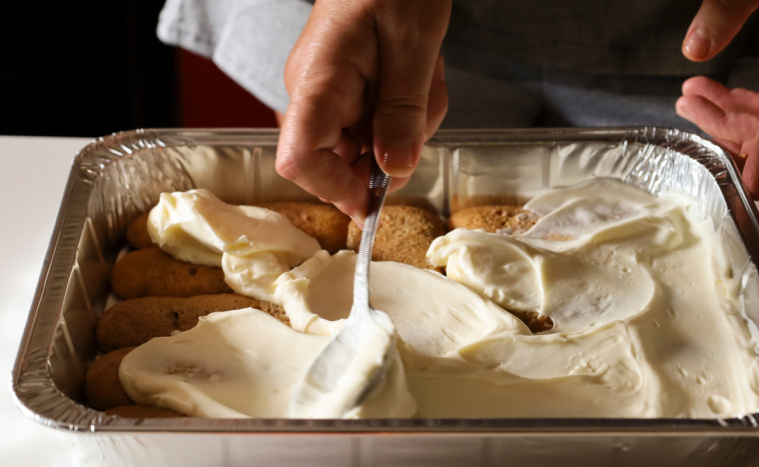 - Wyłóż dno formy (24 x 34 cm) papierem do pieczenia. Ułóż biszkopty i delikatnie nasącz je „ponczem”, nakładając płyn łyżką.