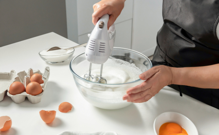 - Białka ubij na sztywno w mikserze z połową ilości cukru, a ubitą pianę odstaw na później.