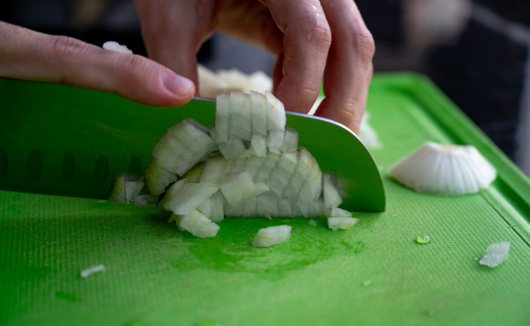 - Pokrój czerwoną paprykę i cebulę w kostkę.