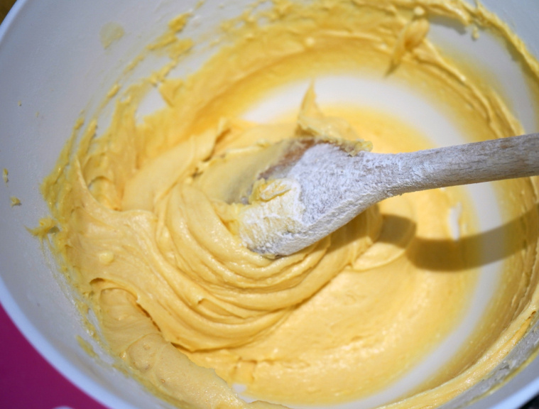 - Wtedy wsyp do niej przesianą mąkę razem z proszkiem do pieczenia oraz roztopione i wystudzone masło.