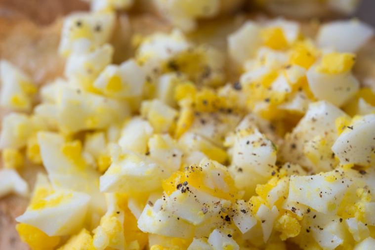 - Ugotuj jajka na twardo, jeśli nie masz ich wcześniej przygotowanych. Ostudź je, obierz ze skorupek i posiekaj drobno żółtka, białka nieco grubiej.