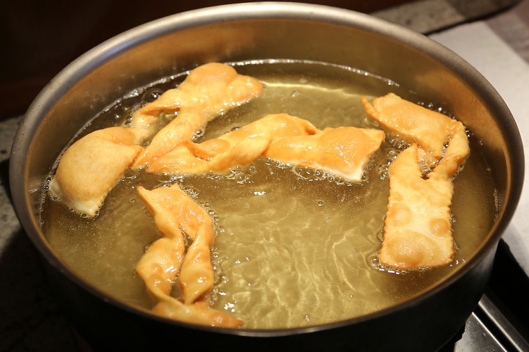 Żeby jednak czeskie faworki wyszły megachrupiące, pamiętaj, żeby smażyć je w mocno rozgrzanym, głębokim tłuszczu. Możesz wybrać smalec lub olej, ważne, żeby faworki wkładać do garnka dopiero, kiedy tłuszcz odpowiednio się nagrzeje. Łatwo to sprawdzić, wrzucając na powierzchnię mały kawałek ciasta. Jeśli wypłynie w ciągu 1-2 sekund, a wokół niego natychmiast pojawią się maleńkie pęcherzyki, oznacza to, że tłuszcz jest idealny.