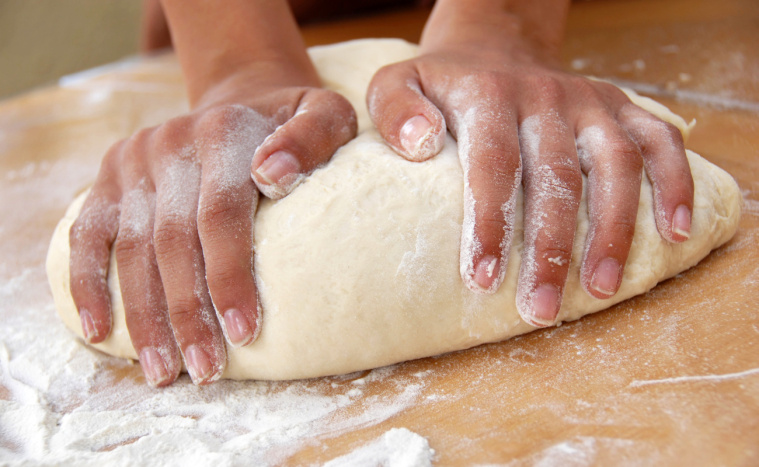 - Podsyp blat roboczy mąką i wyłóż na nią ciasto. Rozpłaszcz je dłonią na gruby placek.