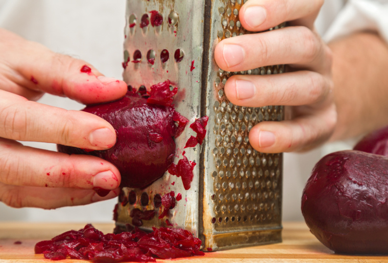 - Do przygotowania tartych buraczków możesz wykorzystać duże, jak i małe warzywa. Wybierz jednak takie o podobnej wielkości, aby ugotowały się jednocześnie. Buraki umyj, odetnij ogonki, ale nie obieraj. Włóż je do dużego garnka i zalej wodą (powinny być całkowicie przykryte). Gotuj przez ok. 45 minut, aż będą miękkie (delikatnie wbij w nie widelec, aby sprawdzić, czy są gotowe). Wyjmij je z wody i pozostaw do ostygnięcia.