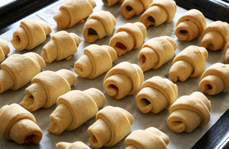- Rogaliki układaj na blaszce wyłożonej papierem do pieczenia. Piecz w piekarniku nagrzanym do 170 stopni przez 20 minut, aż będą złociste i chrupiące
