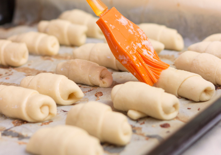 - Układaj je na blaszce wyłożonej papierem do pieczenia. Przed pieczeniem posmaruj je roztrzepanym białkiem i obtocz w cukrze krysztale (z wierzchu).