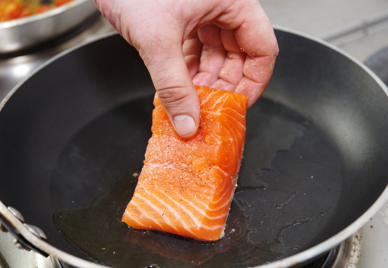 - Filety z łososia (lub innej ulubionej ryby, ale łosoś pasuje tu doskonale) pokrój na mniejsze kawałki, oprósz solą i pieprzem cytrynowym, a następnie krótko usmaż na patelni.