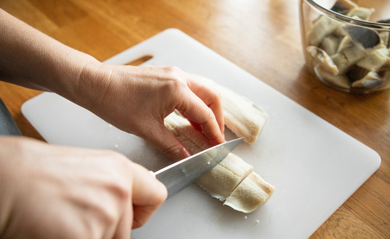 - Odsącz śledzie bardzo dokładnie w papierowe ręczniki i pokrój na kawałki: 1 płat na 4-5 kawałków.