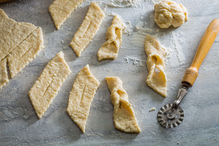 - W środku każdego zrób nacięcie o długości 5-6 cm i przełóż przez nie jeden koniec ciasta, tworząc charakterystyczną kokardkę.