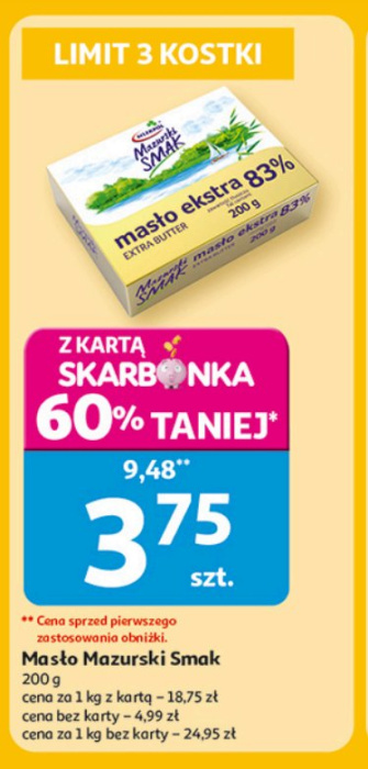 Cena jednej kostki masła w promocji to 3,75 zł. Cena masła bez karty (czyli bez promocji) to 4,99 zł. W przeliczeniu na kilogramy oznacza to cenę 18,75 zł na kg masła z kartą lojalnościową i 24,95 zł bez tej karty.