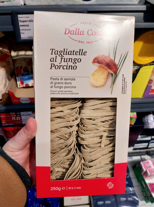 Producentem tego makaronu jest firma Dalla Costa, jeden z największych producentów makaronu we Włoszech. Opakowanie kosztuje 8,99 zł za 250 g. Po połączeniu z sosem ta ilość wystarcza na 3-4 solidne porcje obiadowe. Jeśli chcesz wypróbować, jak smakuje, znajdziesz go w Lidlu na dziale z produktami sezonowymi. Rozpoznasz go po uroczym grzybku na froncie kartonu.