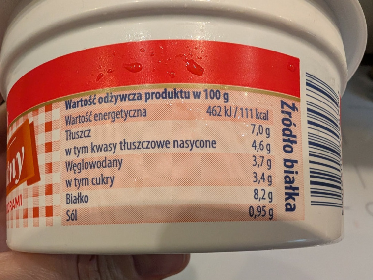 To produkt, który dobrze syci. Białko z twarogu sprawia, że nawet niewielka porcja potrafi zaspokoić pierwszy głód, dlatego możesz sięgnąć po taki serek jako szybkie śniadanie albo kolację. Sprawdź listę makroskładników: