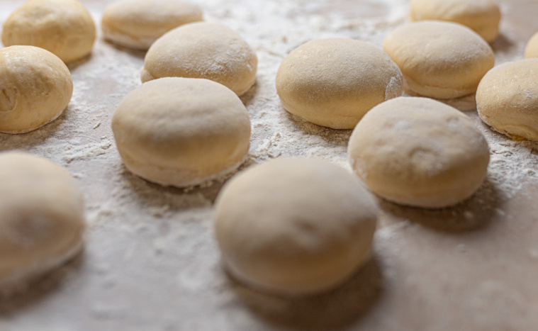 - Wyrośnięte ciasto wyjmij na oprószony mąką blat roboczy. Krótko wyrób, a następnie oddzielaj porcje ciasta (po ok. 50 g) i formuj kule.