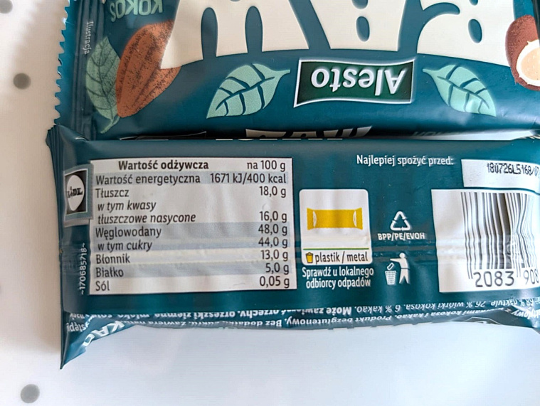 To grubsze, pakowane pojedynczo batony, które w Lidlu najczęściej są obok lub pod batonami proteinowymi. Nie rzucają się w oczy, ale jeśli raz po nie sięgniesz, jest duża szansa, że wrócisz do nich i wrzucisz do koszyka kilka na zapas. Kosztują 2,99 zł, ale regularnie są w promocji. Ostatnio nawet po 2,79 zł, więc to świetny moment, żeby zrobić zapasy. Ja najbardziej lubię wersję Kakao&Kokos. Gdy po raz pierwszy lata temu wzięłam kęs, smak skojarzył mi się z popularnym Bounty. I od tej pory zaczęłam traktować go jako lepszy, prostszy pod względem składu zamiennik. Jeśli dbasz o to, by nie było w twoim jadłospisie zbyt wiele cukru, to może być dobry krok, by odzwyczaić się od typowych słodyczy z jego toną.