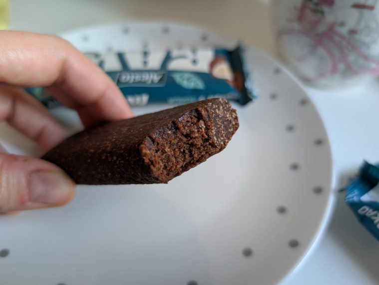 Baton daktylowy marki wygląda trochę jak domowy blok czekoladowy, tylko w wersji mini i bardziej zwartej. Batonik jest mocno sprasowany, ale nie twardy. Nie rozpadnie się w torbie czy plecaku. Ma też treściwą, gęstą konsystencję. Nie musisz się męczyć z odgryzaniem, nie trzeba go ciąć nożem. Łatwo się gryzie i ma przyjemną, lekko wilgotną strukturę. Jeżeli lubisz intensywne, miękkie i sycące przekąski – będzie ci smakować. To dość gruby baton, więc nie rozpada się w dłoni, nie kruszy się i nie brudzi. To ważne, jeśli planujesz zabrać go ze sobą do torebki albo do pracy.