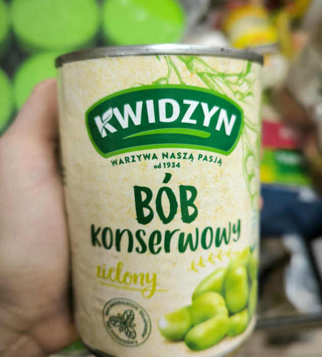 Bób konserwowy marki Kwidzyn to gotowe, zielone ziarna, które wystarczy odsączyć i od razu wrzucać na patelnię albo do sałatki. Ja dorwałam go w sklepie Dino. Puszka kosztuje 4,75 zł i zawiera 240 g samych ziaren (nie licząc zalewy).