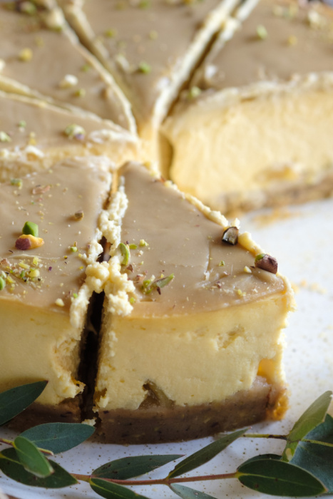 Jest wyjątkowo kremowy i wręcz luksusowy, choć nie zawiera czekolady, rodzynek ani skórki pomarańczowej. Wymarzoną konsystencję oraz swój obłędny smak zawdzięcza dodatkowi chałwy (zarówno w masie serowej, jak i polewie). Nie bawię się tutaj w robienie kruchego ciasta na spód. Prosta masa z kakaowych herbatników i masła spełnia to zadanie na medal.