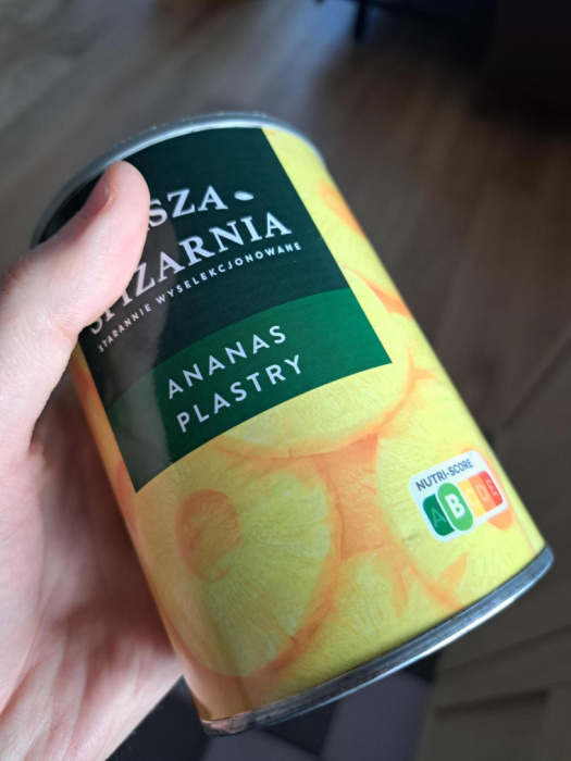 Ananas w puszce to nic innego jak charakterystyczne krążki owocu zanurzone w słodkim syropie. Najczęściej spotyka się właśnie plastry z wyciętym środkiem, które przez lata stały się wręcz symbolem tego produktu, ale dziś coraz częściej w sklepach obecne są także ananasy od razu pokrojone w kostkę (np. sieć sklepów Biedronka oferuje obydwa typy tej owocowej konserwy). W odróżnieniu od świeżego ananasa, ma on bardziej miękką strukturę i wyraźnie słodszy, jakby nieco „kompotowy” smak.