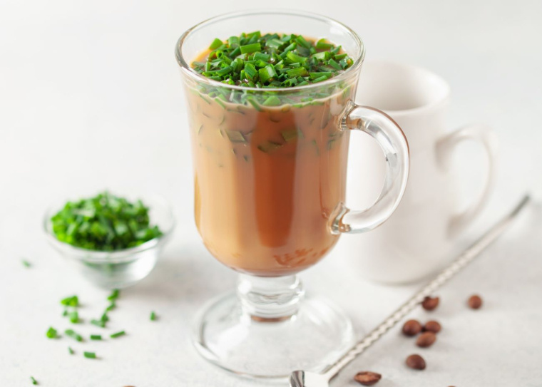 Mleczna kawa ze szczypiorkiem (cebulą dymką), czyli scallion latte, pierwszy raz pojawiło się w pewnej rzemieślniczej kawiarni w Chinach w maju zeszłego roku, ale świat do dziś nie może nadziwić się tym nietypowym połączeniem i historia wraca jak bumerang. Na początku kawa trafiła na żyzny grunt napojów na ochłodę. I szczerze mówiąc, w wydaniu letnim ma sporo logiki. Dodatek z ogródka kojarzy się z orzeźwiającymi sałatkami i modnymi zielonymi koktajlami. Jest lekko pikantny, więc na pewno podbija smak delikatnej mlecznej kawy, poza tym ciekawie przełamuje paloną goryczkę. Podany na dobrze zmrożonej latte pozostaje przyjemnie chrupki, wiec wzbogaca także doświadczenie smakoszy oparte na konsystencji.