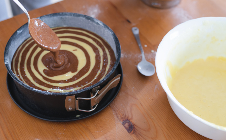 Natomiast, żeby uzyskać dwukolorowy efekt pasów zebry, wystarczy prosty trik. Trzeba na środek formy wylewać na zmianę 4 łyżki białej i 4 łyżki ciemnej masy, do momentu, aż zużyje się całe ciasto.