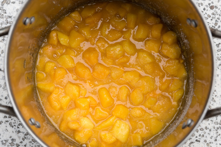 - Gdy składniki się połączą, stopniowo dodawaj po jednym jajku, miksując przez kilka sekund po każdym dodaniu. Następnie wsyp skrobię ziemniaczaną lub proszek budyniowy. Miksuj przez kilka sekund, aż składniki dobrze się połączą. Dojrzałe mango zblenduj na gładką masę i dodaj do masy serowej. Zmiksuj tylko do połączenia się składników.