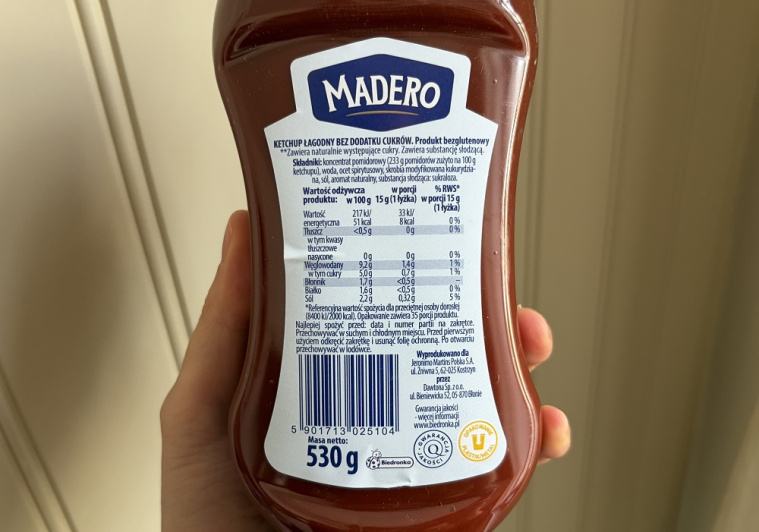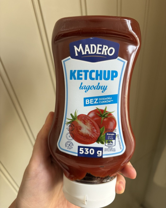 Oprócz samego smaku bardzo pozytywnie zaskoczył mnie też skład tego produktu. Znajdziemy tu m.in. koncentrat pomidorowy, ocet spirytusowy, przyprawy i substancję słodzącą zamiast cukru. Bez zbędnych dodatków i bez kombinowania – po prostu prosty, sensowny produkt. Do tego ma świetną konsystencję: nie za rzadki, nie za gęsty, idealny do wszystkiego.