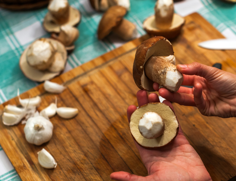 - Grzyby oczyść z ziemi, liści i mchu oraz opłucz je pod zimną wodą. Małe zostaw w całości, a większe pokrój na mniejsze kawałki.