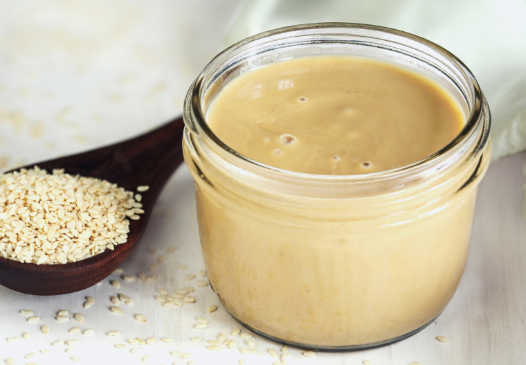 Do surówki dodaję 2 łyżki pasty tahini. Choć nazwa brzmi nieco orientalnie, to produkt ten dostaniesz nawet w dyskontach typu Biedronka czy Lidl. Tahini to pasta z prażonych nasion sezamu. Od wieków znana i lubiana w krajach Bliskiego Wschodu (Libanie, Syrii czy Izraelu). Tam używana jest na co dzień jako dodatek do sosów, past, marynat, zup, a nawet słodkich deserów. W Polsce nie jest tak popularna, a szkoda, bo potrafi podkręcić smak potraw o 200%. Tahini jest niezwykle kremowe, w smaku orzechowe, nieco gorzkawe, a jednocześnie lekko słone. Zobacz, jak wygląda na zdjęciu poniżej.