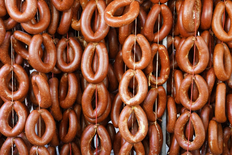 Sucuk (czyt. sudżuk) to turecka kiełbasa z długo dojrzewającego mięsa, zazwyczaj wołowego, choć bywają też wersje z dodatkiem jagnięciny i cielęciny. Nie spotkasz jej w wersji wieprzowej. Przyprawiona dużą ilością czosnku, mielonej papryki, kminu rzymskiego i pieprzu, ma bardzo wyrazisty, lekko pikantny smak. To kiełbasa sucha, dość twarda, często formowana w charakterystyczne podkówki lub „obwarzanki” i suszona na powietrzu przez kilka tygodni lub wędzona. Dzięki temu nabiera intensywnego aromatu i zwartej konsystencji.