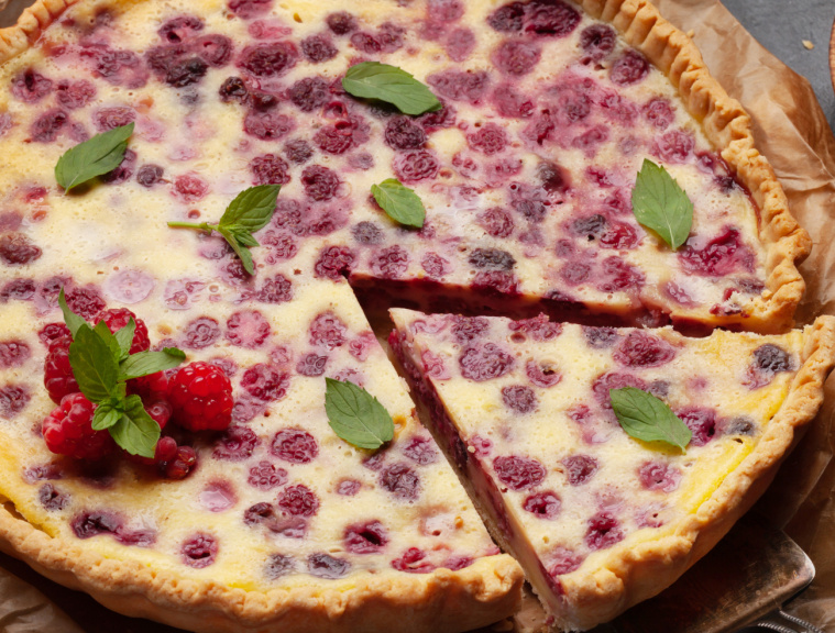 - Na ciasto kruche wyłóż umyte i osuszone maliny (użyj jędrnych owoców, aby zachowały kształt po upieczeniu). Zalej je masą budyniową. Wstaw do piekarnika nagrzanego do 180 stopni i piecz przez 30-35 minut, aż się zezłoci.