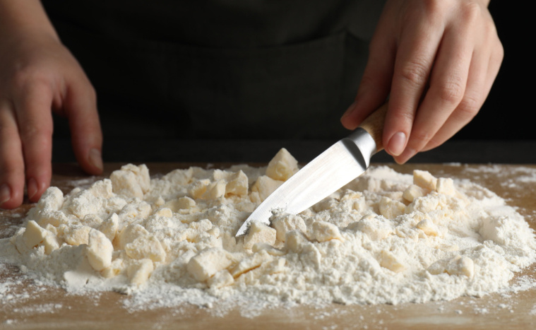 - Na desce posiekaj zimne masło na niezbyt duże kawałki i dodaj je do suchej mieszanki.