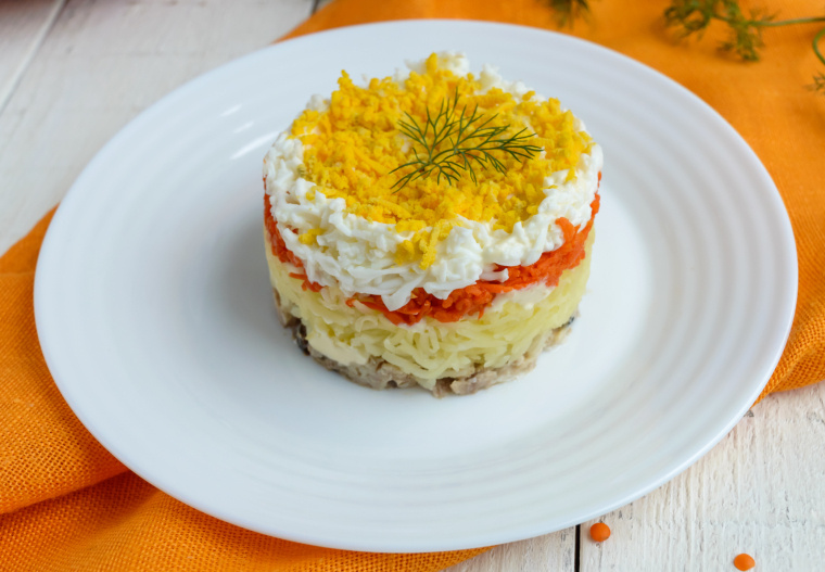 - Na koniec posyp sałatkę żółtkami startymi na tarce na drobnych oczkach.