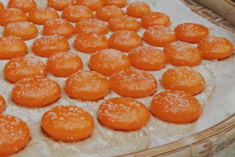 Suszone żółtka brzmią dziwnie, ale smakują wybornie, choć u nas jeszcze nie są popularne. Ten azjatycki przysmak powstaje z samych żółtek poddanych peklowaniu, a następnie suszeniu. Najczęściej wykorzystuje się do tego mieszankę soli i cukru w proporcji 1:1. Żółtka układa się w takiej zasypce na kilka dni, zwykle na około tydzień, dzięki czemu tracą część wilgoci, stają się zwarte, a ich smak mocno się koncentruje. Potem trzeba je jeszcze dosuszyć, aż zrobią się twarde i będą nadawały się do ścierania na tarce. W takiej postaci wyglądają trochę jak pomarańczowe cukierki, ponieważ robi się na nich twarda, błyszcząca skorupka.