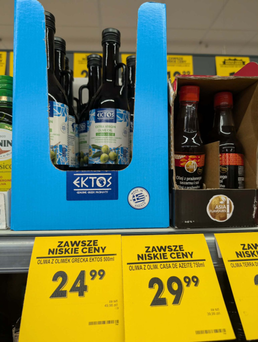 Co ważne, w Biedronce kupisz 500 ml oliwy Ektos Chania Kritis za około 24,99 zł, a w promocji trafia się nawet za 19,99 zł. To bardzo dobra cena, zwłaszcza że w podobnej kwocie często dostępne są oliwy typu pomace, czyli produkowane z resztek po pierwszym tłoczeniu - zdecydowanie gorszej jakości.