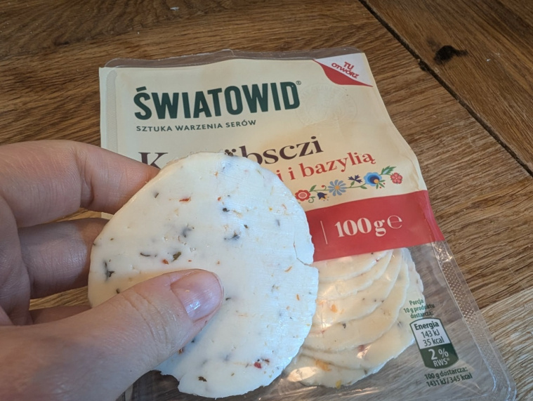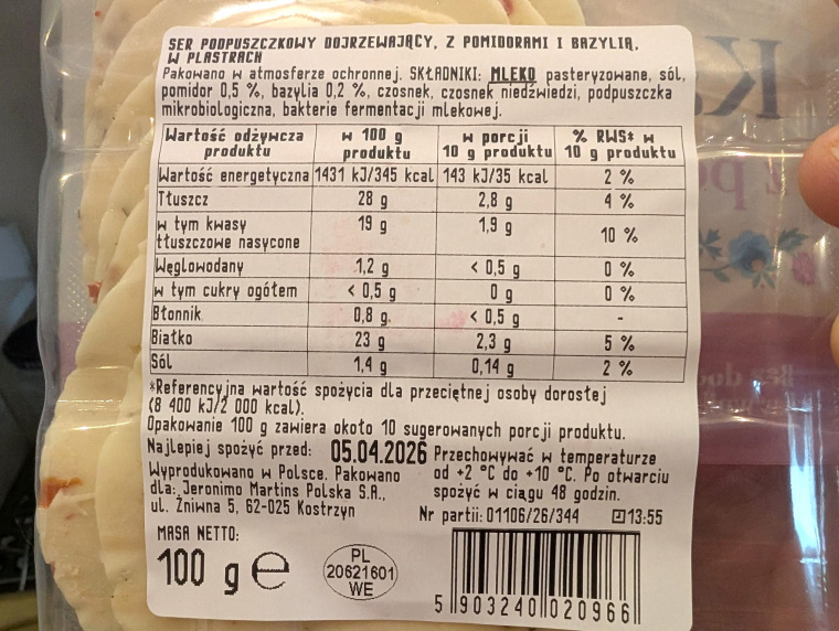 Ilość pomidorów i bazylii może nie jest powalająca, ale daje o sobie znać i dodatki są wyczuwalne. Nie wyróżniono w składzie żadnych sztucznych aromatów, a i tak po otwarciu opakowania tę bazylię, podobnie jak lekko kwaskowy aromat pomidorów wyraźnie czuć. Ser jest dość zwarty i tłusty, nie kruszy się, choć ma niewielkie pęknięcia na plasterkach. W 100 g ma 28 g tłuszczu.