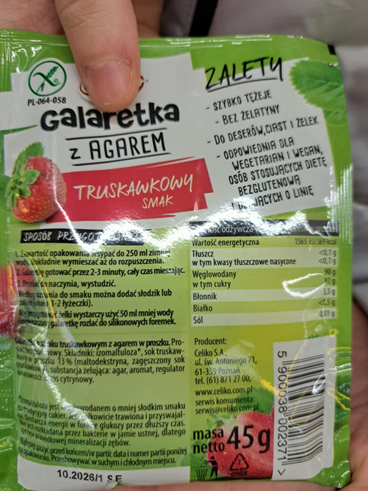 Galaretka z agarem to produkt marki Celiko, dostępny obecnie m.in. w sklepach Biedronka. Na pierwszy rzut oka wygląda jak klasyczna galaretka w proszku, jednak różni się od większości dostępnych na rynku tym, że nie zawiera żelatyny.