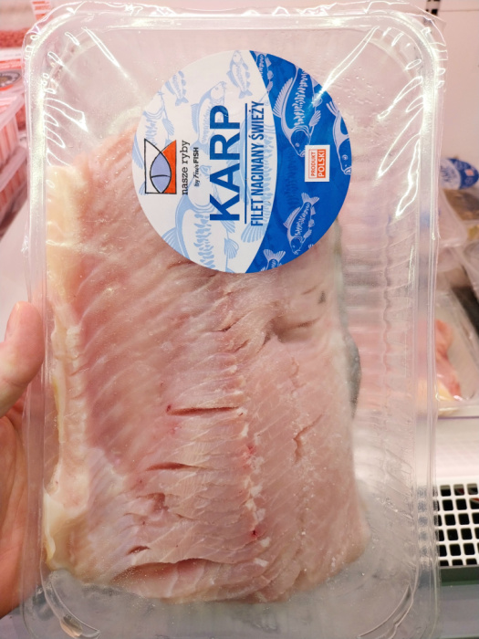 Surowe karpie zostały zapakowane w technologii MAP (Modified Atmosphere Packaging), czyli z opakowań został usunięty tlen. To sprawia, że ryby nieco dłużej są świeże. Karpia po zakupie trzeba przechowywać w lodówce w temperaturze 0-2 stopni C. Koszt takiego karpia to 5,99 zł za 100 g. Za solidny, prawie 600-gramowy filet, zapłaciłam 35,46 zł.