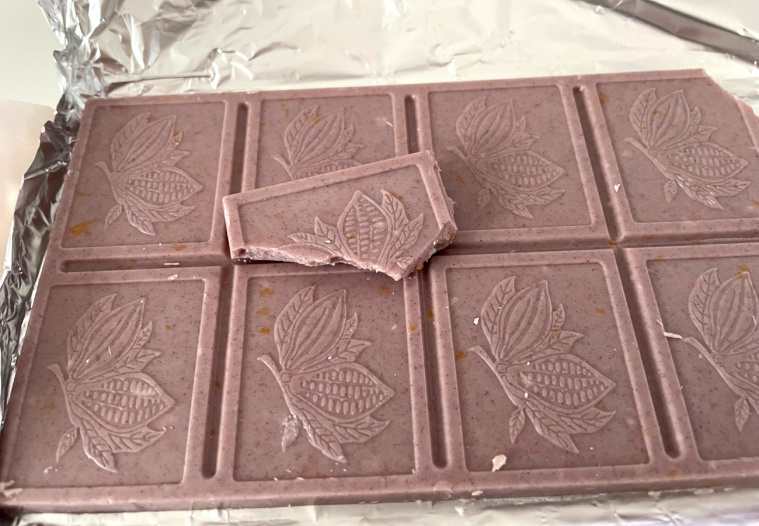 Zanim powiem ci o smaku, najpierw troszkę o kolorze. Gdy otworzyłam opakowanie, nieco się zdziwiłam. Czekolada wcale nie jest tak mocno fioletowa, czego się spodziewałam. To raczej lekki fiolet wpadający w brąz. To, co mnie jednak od razu zachwyciło, to zapach. Pachnie obłędnie, i nawet jak piszę te słowa, to cały czas kusi mnie swoim aromatem.
