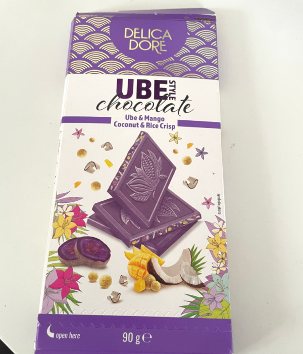 Nic dziwnego więc, że również Lidl dołączył do tego trendu. 13 kwietnia wprowadził on do swojej oferty produkty, w których główną rolę odgrywa ube. Oprócz czekolady można znaleźć jeszcze migdały z ube i precelki. Pozostałych dwóch produktów nie widziałam, ale na czekoladę się skusiłam.