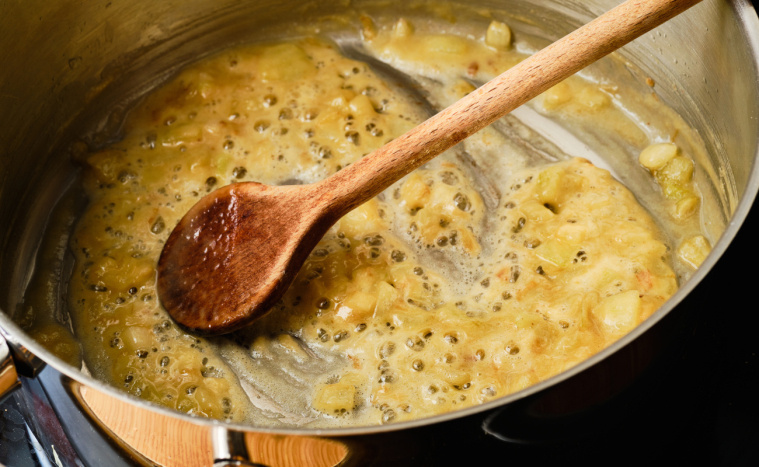 - W rondlu zrób zasmażkę z masła i mąki. Powoli dolewaj do niej wywar z gotowania płucek i warzyw, cały czas mieszając. Powinien powstać gładki, gęsty sos.
