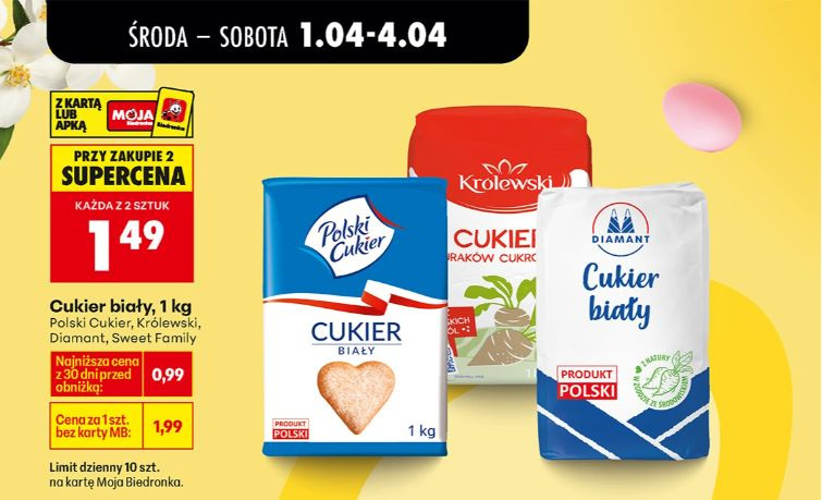 Na maśle się historia nie kończy, bo w Biedronce przed świętami można kupić także w supercenie cukier (standardowe opakowanie 1 kg) – uniwersalny składnik wszelkich wypieków. Dostępne w ramach oferty marki to Polski Cukier, Królewski oraz Diamant. Przy zakupie 2 sztuk każda z nich będzie kosztować 1,49 zł. To kwota dla posiadaczy karty lub aplikacji Moja Biedronka, w przeciwnym razie cena to 1,99 zł za paczkę. Pamiętaj o limicie dziennym – 10 kg. Promocja obowiązuje od środy 1 kwietnia do soboty 4 kwietnia.
