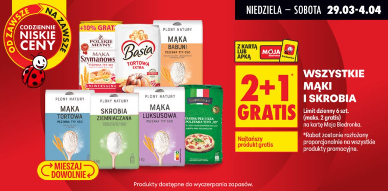 Czego jeszcze brakuje z podstawowych składników na babkę, skoro już składamy ją z promocyjnych produktów jak z klocków? Mąka. Też w atrakcyjnej ofercie, która od razu przyciąga hasłem „2+1”. Obejmuje wszystkie rodzaje mąki (nawet mąkę Gusto Bello do pizzy). Obowiązuje zasada: najtańszy produkt gratis. Promocja trwa już od 29 marca, a kończy się tuż przed Niedzielą Wielkanocną, czyli w sobotę 4 kwietnia.