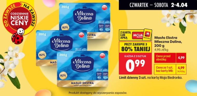 Dosłownie za grosze, bo poniżej złotówki. Jeśli kupisz 3 kostki masła ekstra Mleczna Dolina (standardowe 200 g), za każdą zapłacisz po 99 groszy. To ogromna obniżka, bo aż 80% taniej (cena regularna to 4,99 zł). Bardzo ważne jest, by mieć ze sobą kartę lub aplikację Moja Biedronka, bo tylko wtedy zadziała promocja. Warto też pamiętać, że limit dzienny to 3 sztuki na jedną kartę. Okazja obowiązuje od czwartku 2 kwietnia do soboty 4 kwietnia (włącznie), do wyczerpania zapasów.