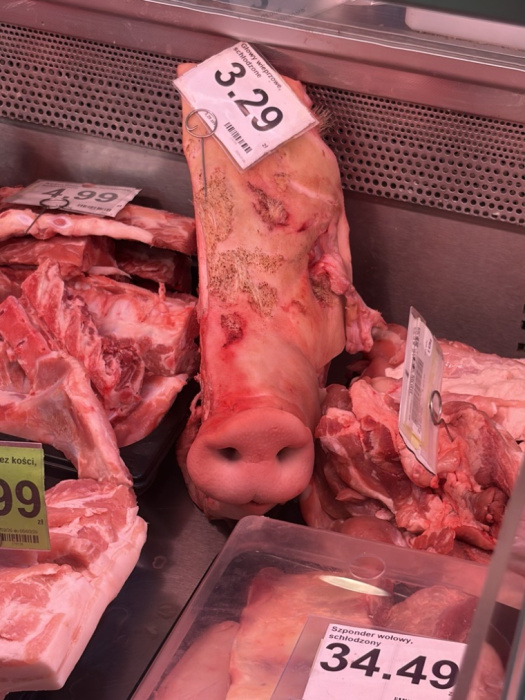 Za ladą mięsną w Dino znajdowała się głowa wieprzowa, czyli mięso na głowiznę. Pewnie 30 lub 20 lat temu nie byłoby to nic szokującego, ale dla mnie widok był wręcz wstrząsający. Nie znam nikogo, kto gustowałby w tym kawałku mięsa, więc nie spodziewałam się, że można kupić go ot tak, bez składania specjalnego zamówienia, w zwykły dzień powszedni.