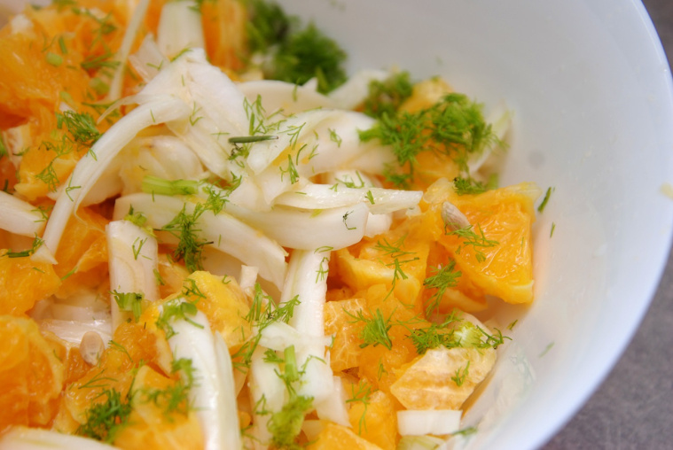 Fenkuł lubi towarzystwo składników o wyraźnym charakterze. Dzięki temu jego delikatny, anyżowy aromat nie ginie, lecz staje się ciekawym akcentem w daniu. Bardzo dobrze komponuje się z cytrusami, szczególnie z pomarańczą i cytryną. Ich kwaskowatość podkreśla jego świeży smak. Do surówki z fenkułu zawsze warto zrobić sos cytrusowy.