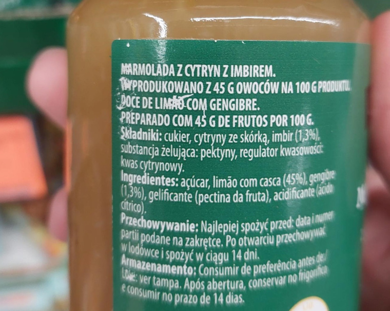 W składzie znajdziesz: cukier, cytrynę ze skórką, imbir (1,3%), pektyny (czyli naturalny zagęstnik), regulator kwasowości oraz kwas cytrynowy. Skład jest więc krótki i prosty, bez konserwantów, barwników czy syropu glukozowo-fruktozowego, często w co 2. słoiku ze sklepowymi przetworami. Cytryna i imbir to zgrany, dopełniający się duet – jeden składnik kwaśny i orzeźwiający, drugi lekko pikantny i rozgrzewający.