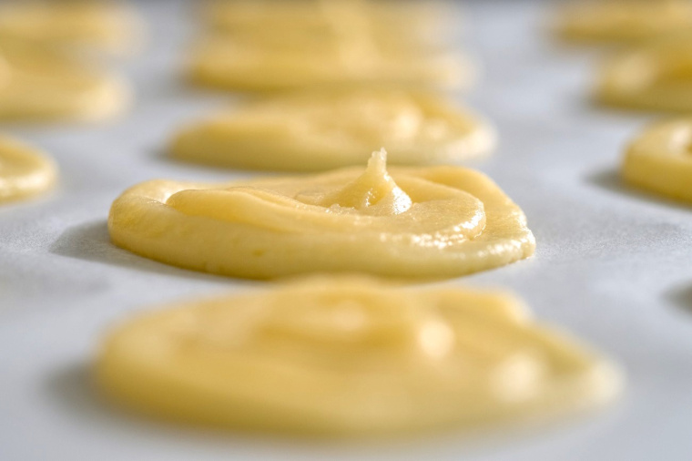 Ciastka najlepiej wyciskać za pomocą rękawa cukierniczego lub woreczka z odciętym rogiem, ale jeśli nie zależy ci na wydłużonym kształcie, masę na blaszkę do pieczenia możesz kłaść po prostu łyżką. Będzie szybciej, a dla początkujących też łatwiej. Jeśli po wyciśnięciu rogi ciastek będą nieco zadarte, zwilż palec wskazujący wodą i „spłaszcz”. Klasyczne języczki powinny być płaskie.